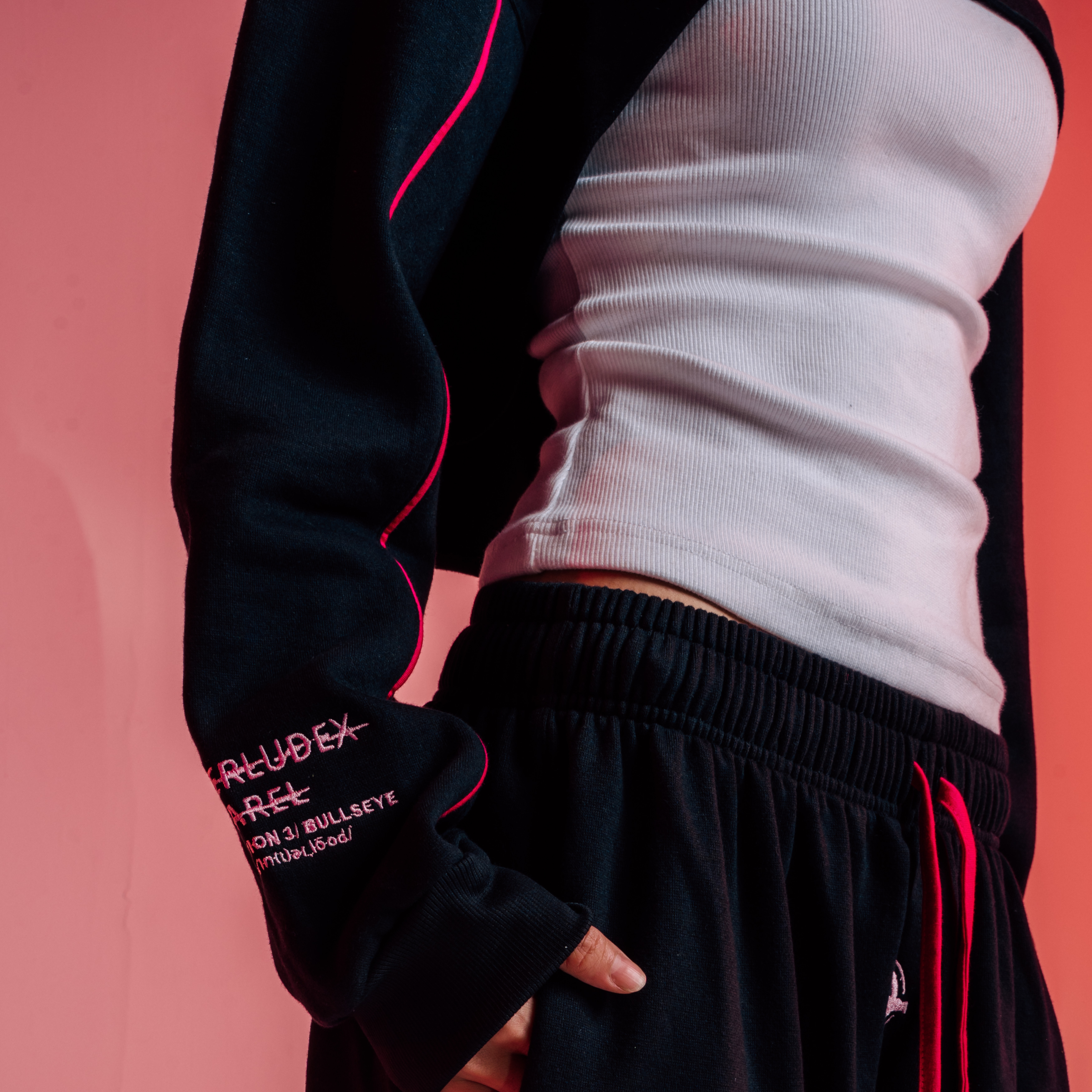 The INTERLUDEX Bullseye Cropped Set features a cropped hoodie and high-waisted sweatpants, both crafted from 100% heavyweight cotton for a premium feel. With bold pink detailing and embroidered logos, this set delivers a striking contrast and elevated streetwear style.