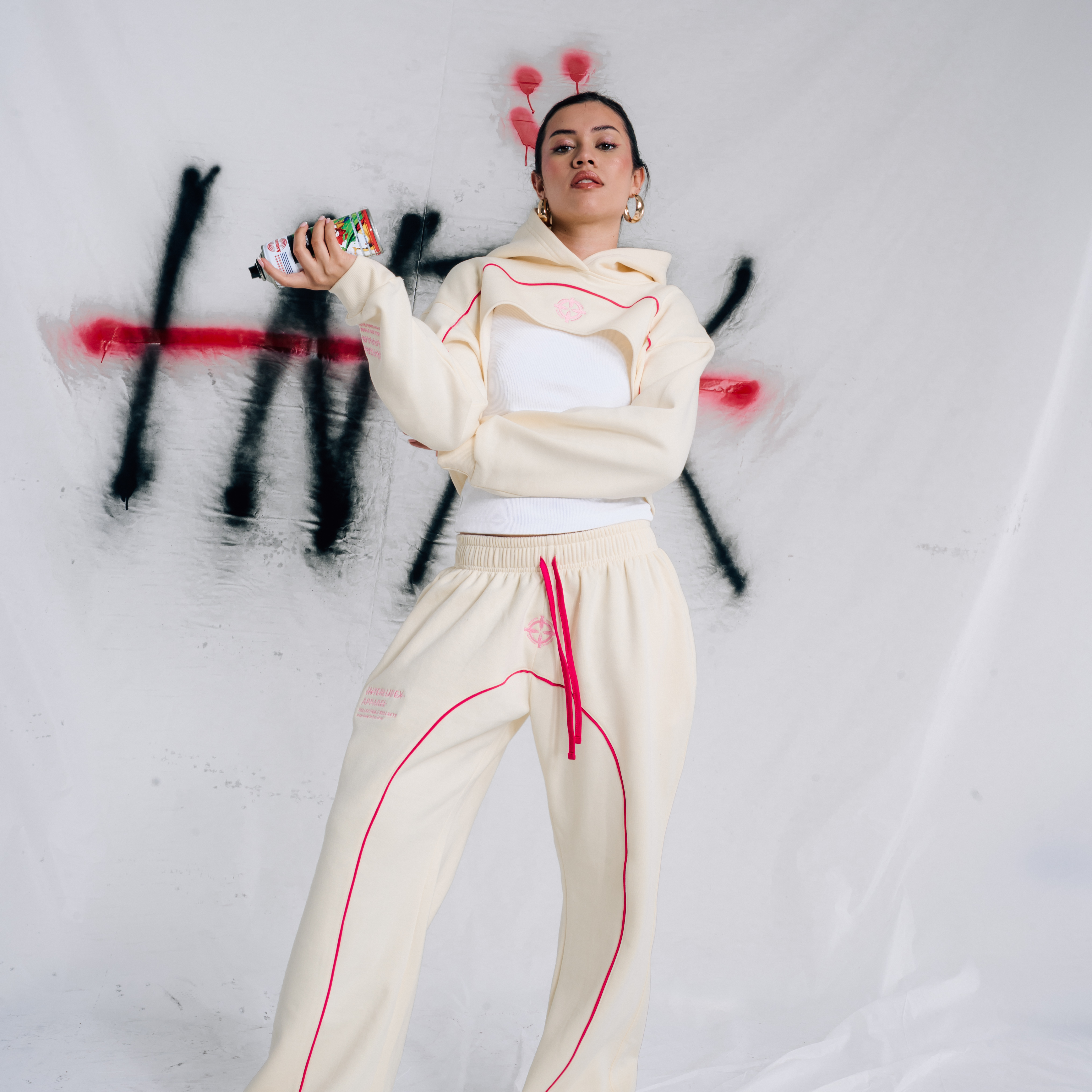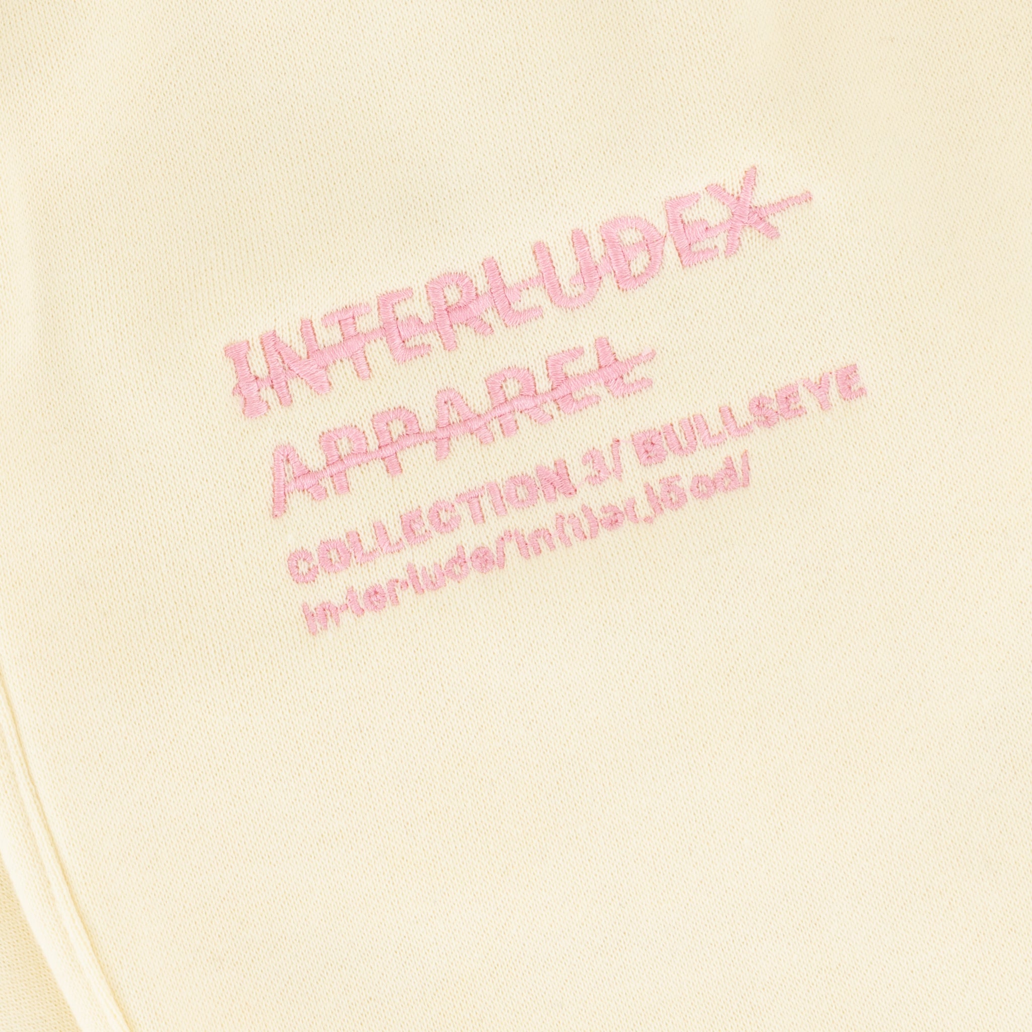 The INTERLUDEX Bullseye Cropped Set combines sleek design with premium comfort, featuring a cropped hoodie and high-waisted sweatpants crafted from 100% heavyweight cotton. Bold pink detailing and embroidered logos create a striking contrast for a standout streetwear look.